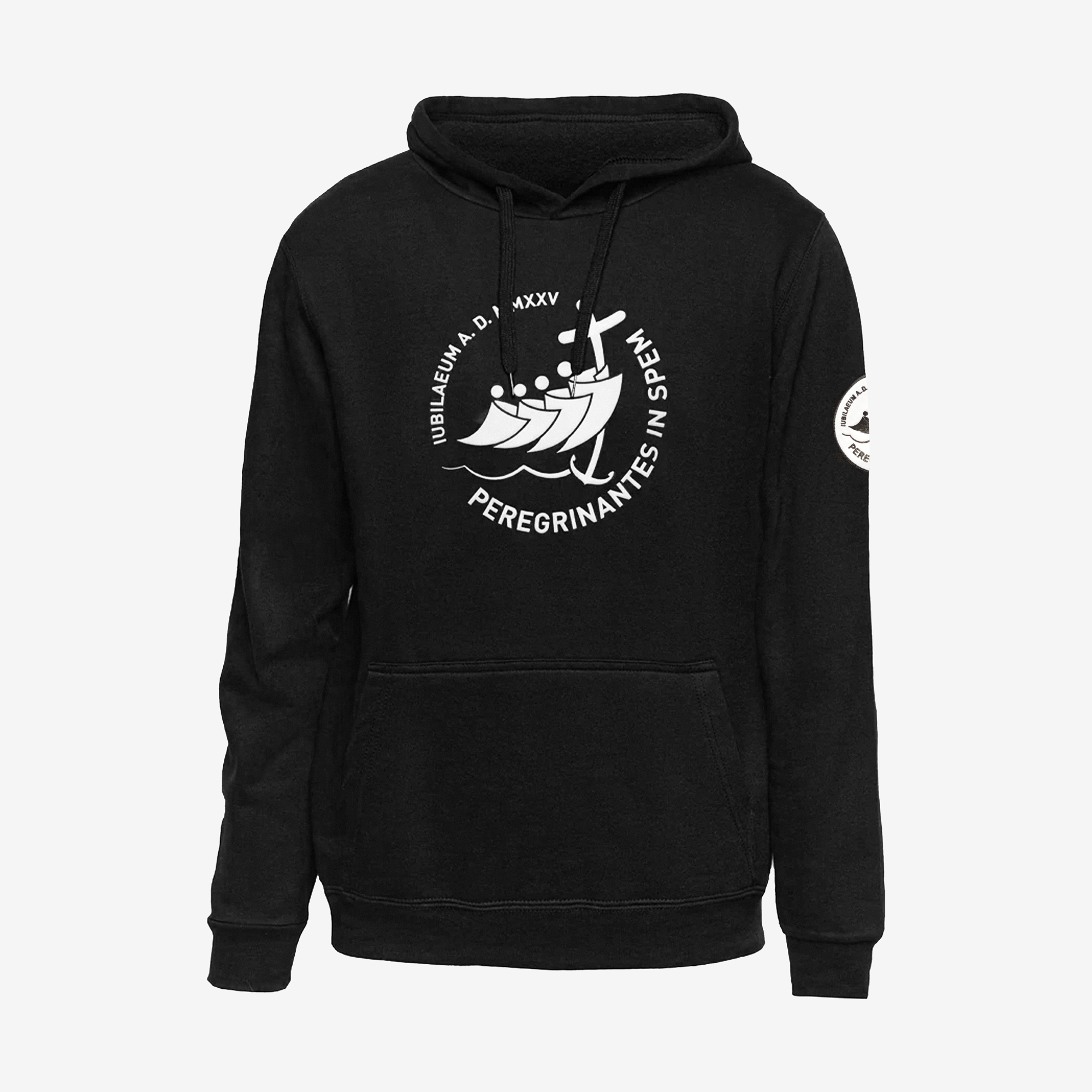 Felpa dal tessuto morbido e confortevole. Il cappuccio permette di ripararsi da vento e pioggia, mentre la tasca a marsupio offre praticità e spazio. Stampa bianca del logo del Giubileo 2025 e patch ricamata su manica sinistra.