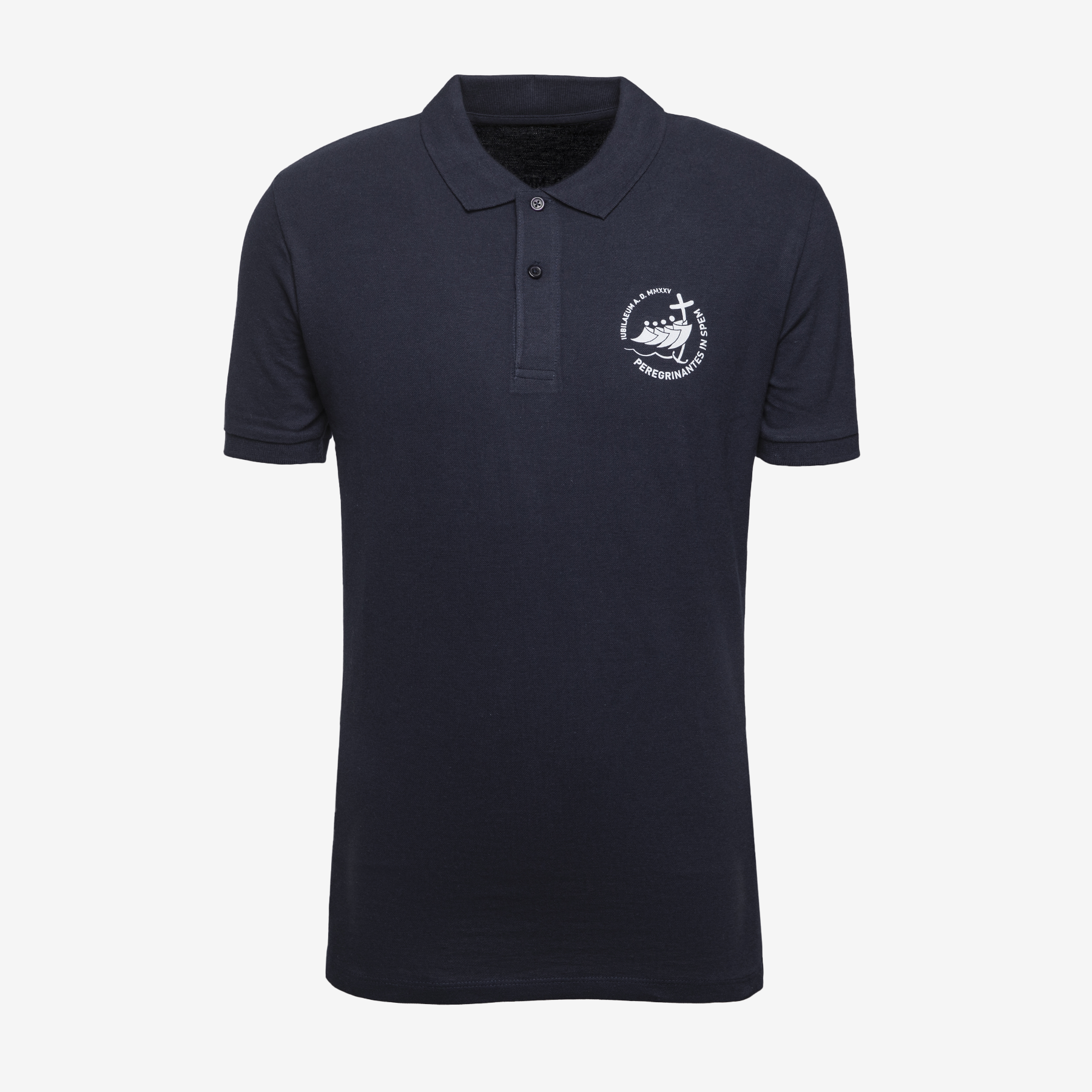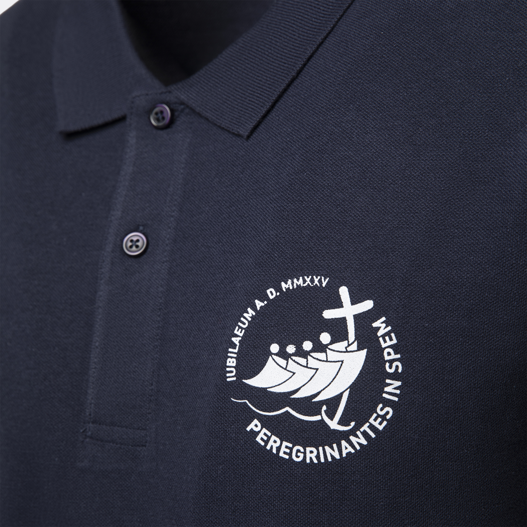Made of high quality cotton , this polo guarantees comfort and breathability even on the hottest days. Elegant and sober design, with ribbed collar and sleeves. The polo, available in white or blue, is personalized on the heart side with the Jubilee 2025 logo.